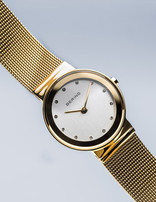 L’étincelant boîtier couleur or, fabriqué à partir d’acier inoxydable pur, de haute qualité médicale (316L), associé au bracelet couleur or en maille milanaise moderne, lui confère le style classique propre à BERING. La facture délicate du bracelet en maille milanaise ajoute à cette montre une touche raffinée, voire noble. Un cadran couleur argentée agrémenté d’ÉLÉMENTS SWAROVSKI, protégé par un verre saphir limpide et anti-rayures, vient souligner cette apparence classique.